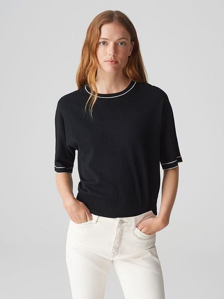 – dekolt: okrągły- długość rękawa: 3/4- detale: kontrastujące paski- krój: prosty- look: jednokolorowy