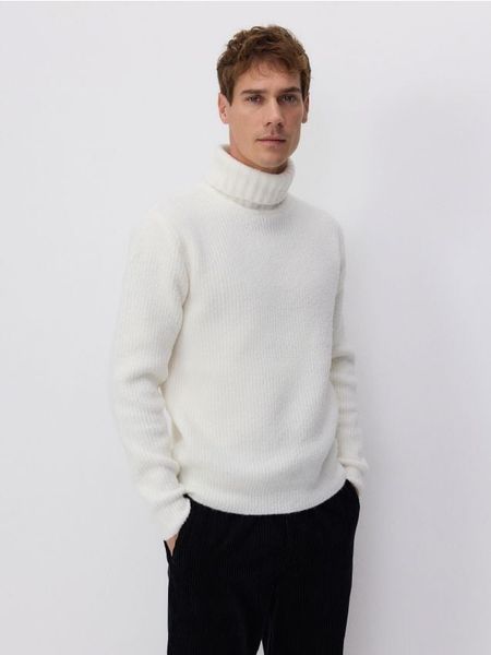 Sweter o prostym kroju, wykonany z dzianiny z domieszką wełny.