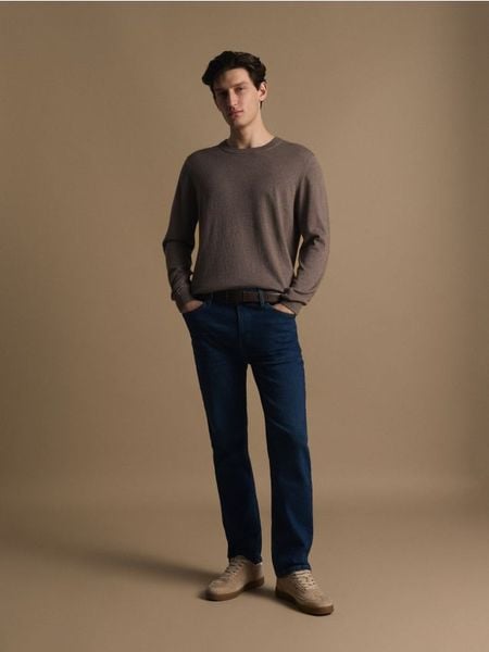 Sweter o prostym kroju, wykonany z dzianiny z domieszką kaszmiru.