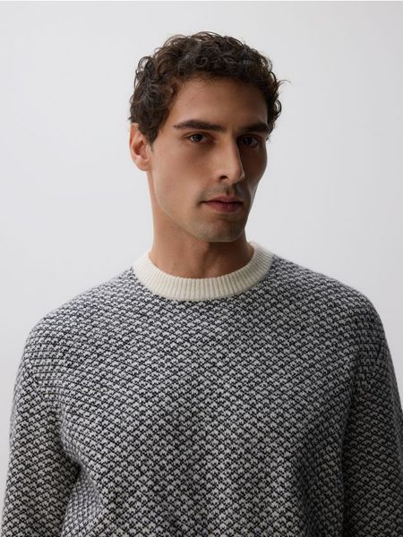 Sweter o prostym kroju, wykonany z dzianiny z bawełną.