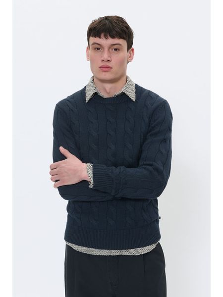 Męski sweter o splocie warkoczowym z dekoltem w serek - granatowy V2 - Rozmiar: S