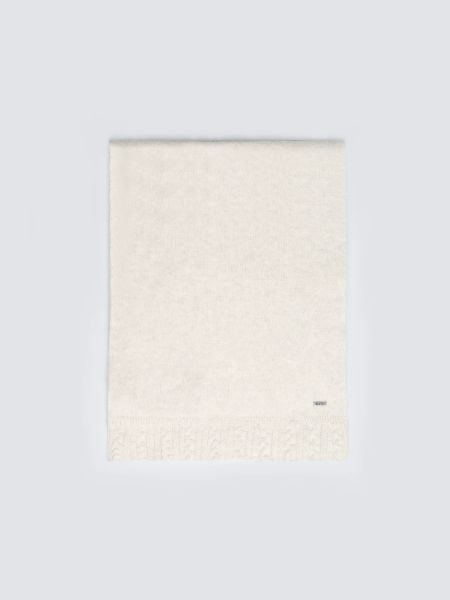 Elegancki szalik damski w kolorze złamanej bieli, zakończony ozdobnym splotem. Subtelna barwa sprawia, że doskonale komponuje się zarówno z jasnymi, jak i kontrastującymi stylizacjami. Delikatny i przyjemny w dotyku materiał zapewnia komfort noszenia, a klasyczna forma nadaje mu ponadczasowego uroku.