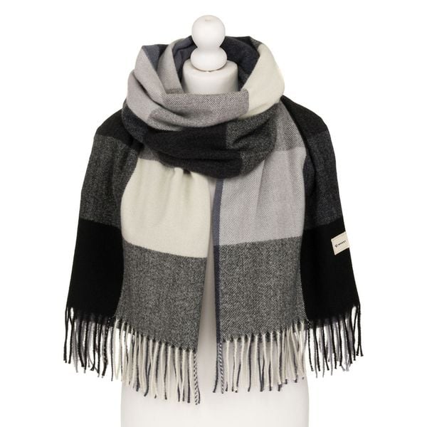 Dwustronny, czarny szalik damski z frędzlami. Wykonany z miękkiego poliestru. Perfekcyjnie komponuje się z płaszczem, kurtką czy swetrem. Idealny na zimowe spacery.