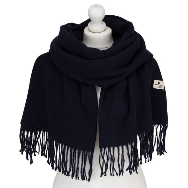 Granatowy szalik damski, dwustronny. Idealny na zimę, jesień i wiosenne chłody. Wykonany z wysokogatunkowego poliestru. Pasuje zarówno do eleganckiego płaszcza, jak i do casualowej kurtki. Szalik ze stylowymi frędzlami.