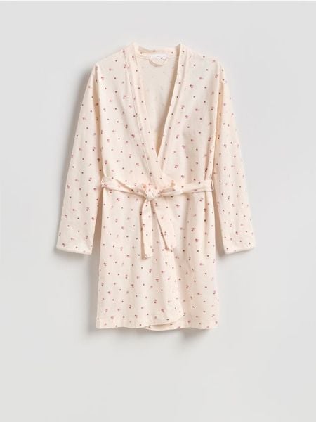 Szlafrok o swobodnym kroju, wykonany z bawełnianej dzianiny.