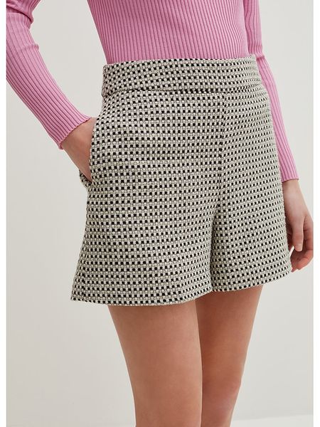 – wysokość pasa: high waist- zapięcie: boczny suwak- kieszenie: wpuszczane- detale: połyskująca nitka – krój: luźny- wzór: kratka
