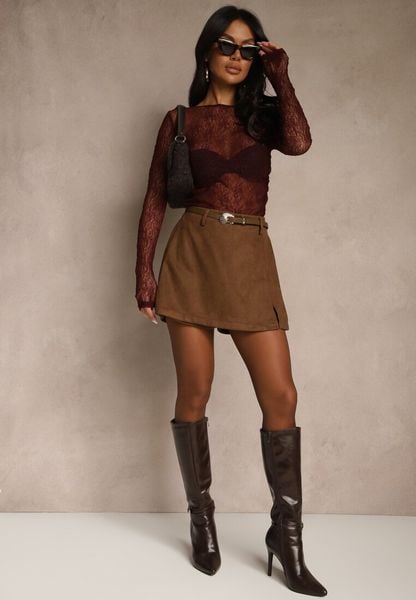 Brązowe Spódnico-Szorty High Waist z Ozdobnym Paskiem Korelea