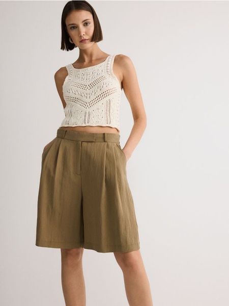 Szorty typu bermudy, wykonane z tkaniny z lyocellem i wiskozą.