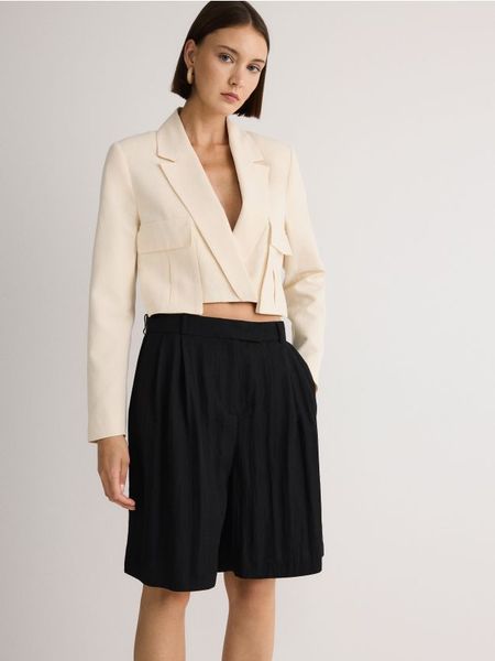 Szorty typu bermudy, wykonane z tkaniny z lyocellem i wiskozą.