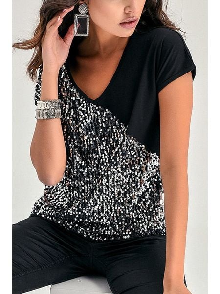 Srebrno-Czarna Bluzka Wykończona Ściągaczem na Dole z Cekinami i Trójkątnym Dekoltem Preozja