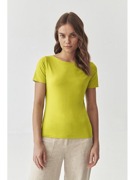 Jasnozielony Bawełniany T-shirt Koszulka z Krótkim Rękawem z Napami przy Dekolcie Fiasta