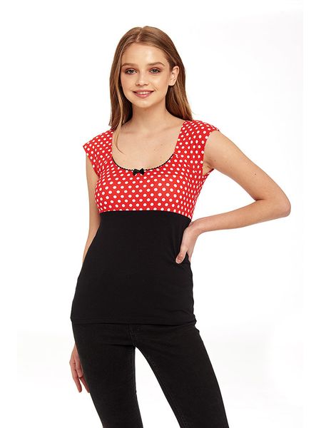 – dekolt: okrągły- detale: przytwierdzone kokardki- krój: wąski- wzór: kropki
