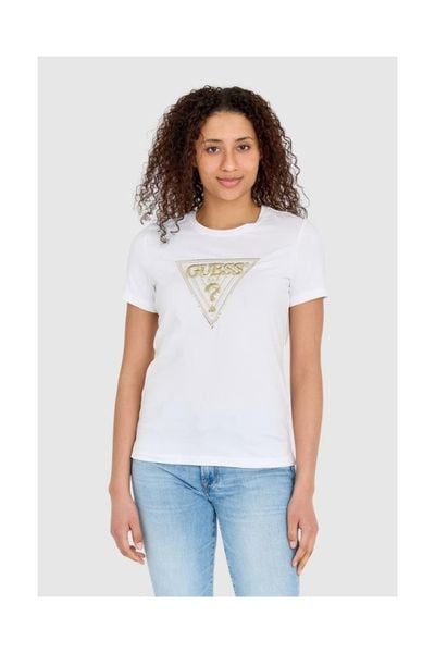 GUESS Biały t-shirt damski ze złotym haftowanym cyrkoniami logotypem slim fit, Rozmiar S