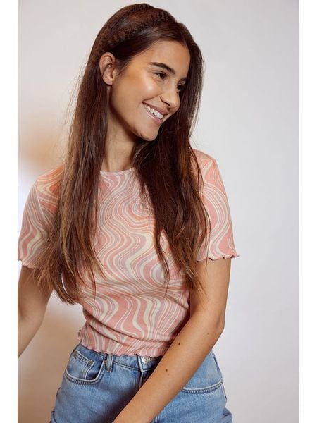 – z dodatkiem poliestru pochodzącego z recyclingu- dekolt: okrągły- zrolowany brzeg: dolny, zakończenia rękawów- krój: cropped- look: jednokolorowy