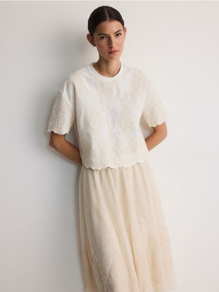 T-shirt boxy z ozdobnym haftem – złamana biel