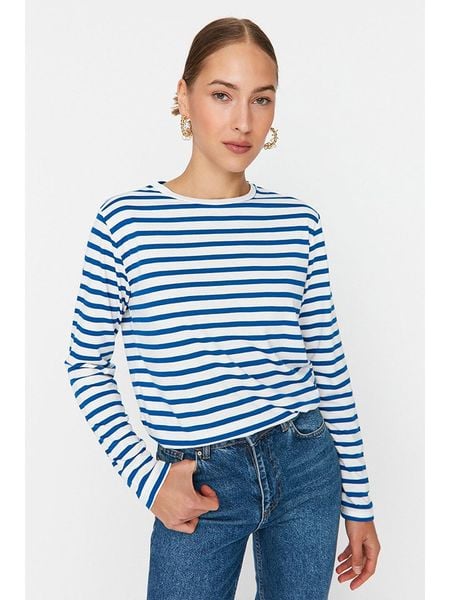 – z dodatkiem bawełny- dekolt: okrągły- krój: prosty- wzór: paski