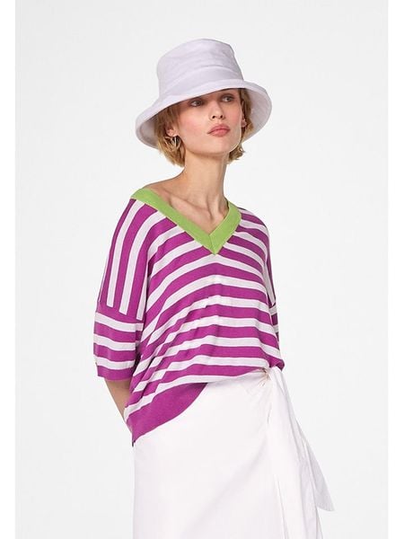 – z dodatkiem jedwabiu- dekolt: V- detale: kontrastujące paski- krój: prosty- wzór: paskiUwaga: Na metkach odzieży tej marki znajdują się rozmiary francuskie. Rozmiarówka została przez nas przeliczona. Podane do wyboru warianty rozmiarów odpowiadają standardowym europejskim rozmiarom konfekcji. Prosimy zapoznać się z zamieszczonym objaśnieniem rozmiarów.