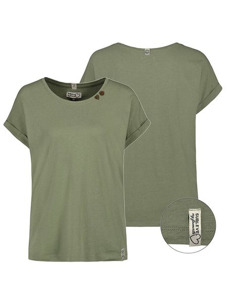– dekolt: okrągły- zakończenie rękawa: podwijane- detale: ozdobne guziki- krój: prosty- look: jednokolorowy