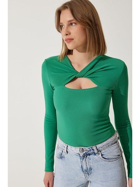 – dekolt: V- detale: wycięcia- krój: wąski- look: jednokolorowy