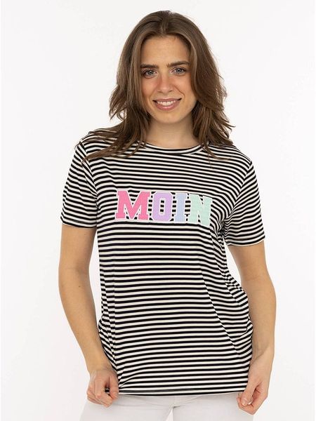 – czysta wiskoza- dekolt: okrągły- krój: prosty- nadruk: w formie napisu- wzór: paski
