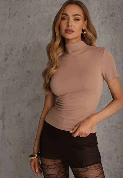Beżowy Wiskozowy T-shirt o Dopasowanym Kroju z Golfem Isomina