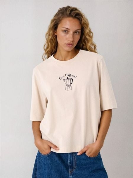 Sinsay – Bawełniana koszulka z haftem – kremowy –