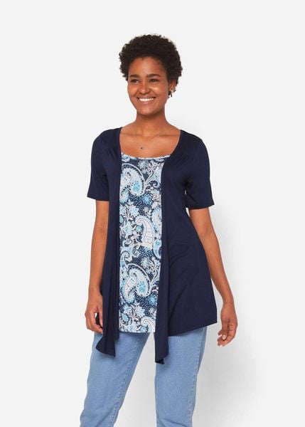 Efektowna koszulka 2 w 1 z nadrukiem, okrągłym dekoltem i krótkim rękawem.