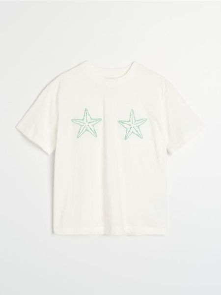 Sinsay – Bawełniana koszulka z haftem w kształcie gwiazd – kremowy –