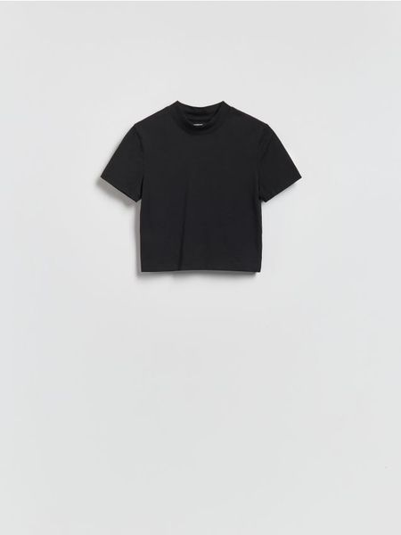 T-shirt o krótszym kroju, wykonany z dzianiny z bawełną.