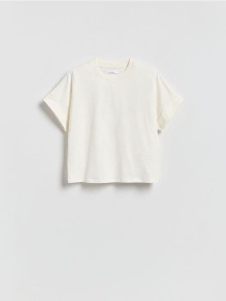 T-shirt o pudełkowym kroju, wykonany z bawełnianej dzianiny.