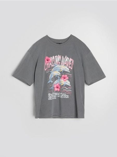 Sinsay – Bawełniana koszulka z nadrukiem delfinów – szary –