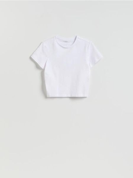 T-shirt o krótszym kroju, wykonany z dzianiny z bawełną.