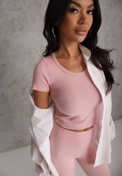 Różowy Krótki T-shirt Basic z Okrągłym Dekoltem Gresalor