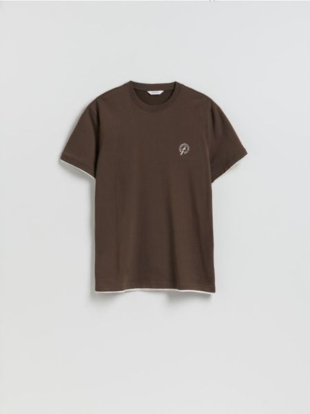T-shirt regular z haftem – ciemnobrązowy