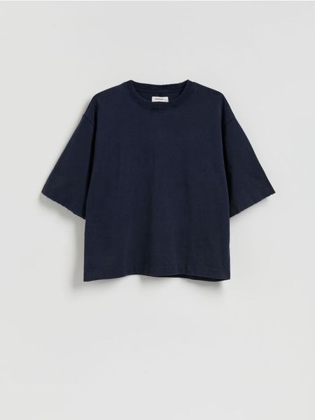 T-shirt cropped boxy z efektem sprania – granatowy