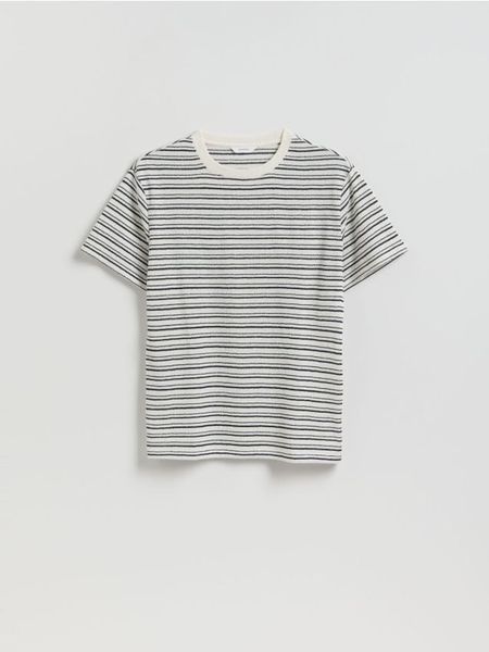 T-shirt o swobodnym kroju, wykonany z grubej dzianiny z bawełną.