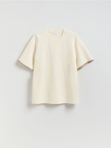 T-shirt o luźnym kroju, wykonany z grubej, bawełnianej dzianiny.