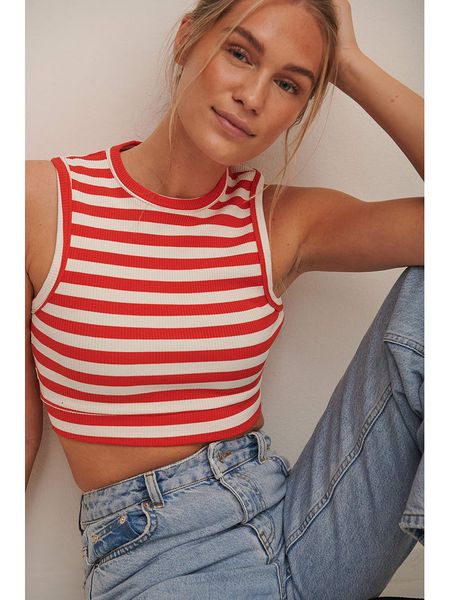 – dekolt: okrągły- look: prążkowany- krój: cropped- wzór: paski