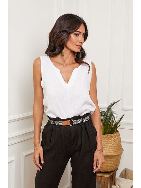 – czysty len- ramiączka: szerokie- dekolt: V- krój: dłuższe plecy- look: jednokolorowy