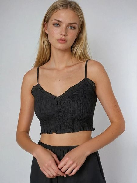 – ramiączka: regulowane- zapięcie: haczyk- dekolt: V- detale: falbany- krój: cropped- look: jednokolorowy