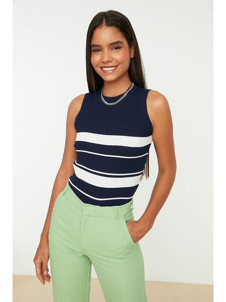 – kołnierz: stójka- ramiączka: szerokie- krój: prosty- wzór: paski- look: prążkowany