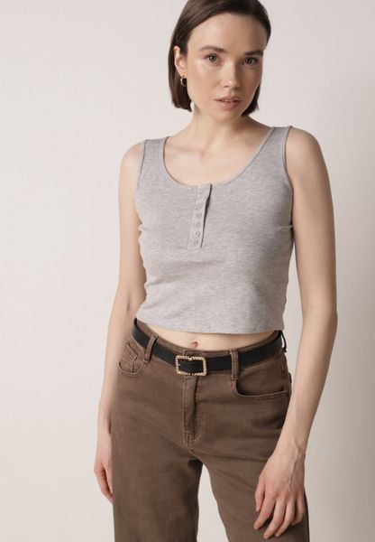 Szary Prążkowany Top na Szerokich Ramiączkach z Bawełny Zdobiony Guzikami Bernella