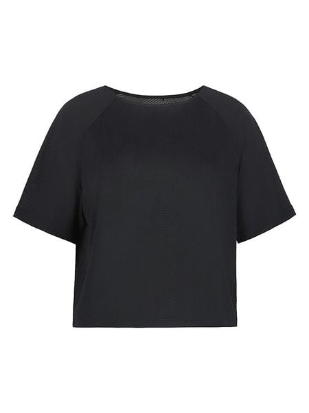 – szybkie odprowadzanie wilgoci na zewnątrz- 4-kierunkowy stretch- fason: regular fit- dekolt: okrągły- detale: haft z logo- krój: cropped, dłuższe plecy- wzór: na całości