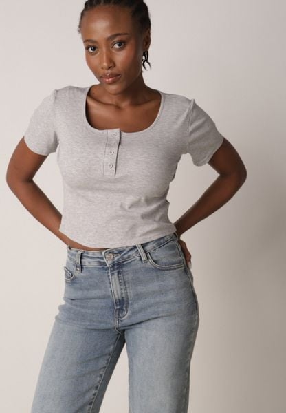Szary Prążkowany Top Bawełniany z Guzikami przy Dekolcie Nedera