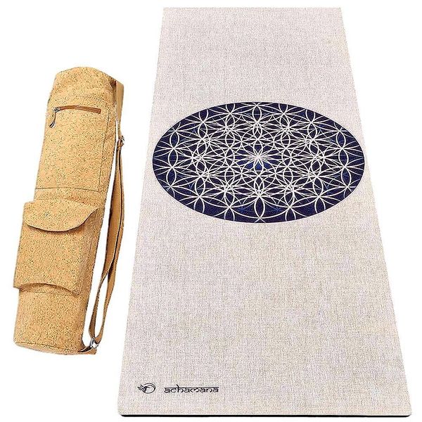 Mata do jogi z gumy i konopi 4,5mm + torba ze skóry korkowej – kwiat życia