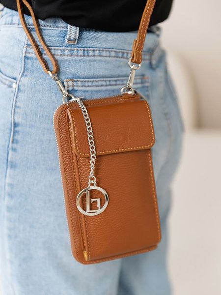– materiał: skóra- długi pasek przez ramię: regulowany, odpinany- zapięcie: suwak- z otworem znajdującym się u góry, umożliwiającym włożenie telefonu- kieszenie wewnętrzne: różne- detale: zawieszka- tekstylna podszewka: tak- wyprodukowano we Włoszech