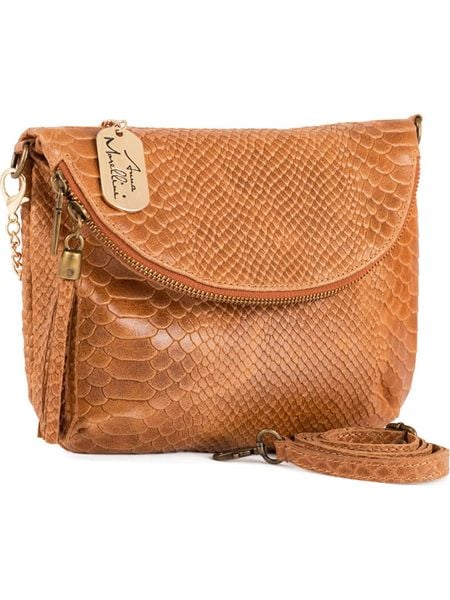 – materiał: skóra- powierzchnia: o fakturze krokodylej skóry- długi pasek przez ramię: regulowany, odpinany- zapięcie: suwak- kieszenie zewnętrzne: tak, na zamek- detale: zawieszka- tekstylna podszewka: tak- wyprodukowano we Włoszech