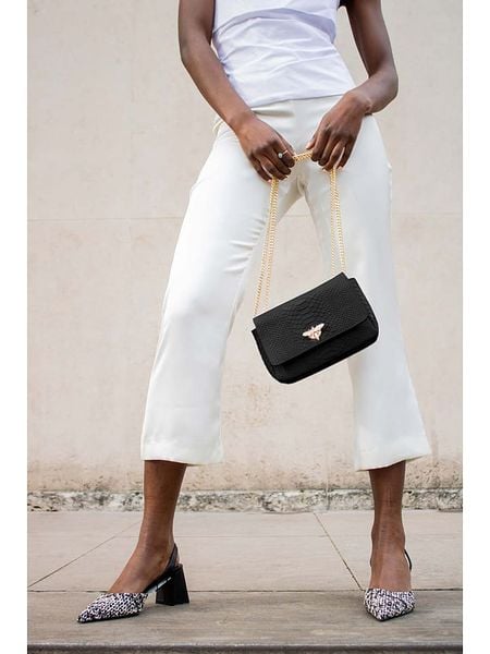 – materiał: skóra- powierzchnia: o fakturze krokodylej skóry- krótki pasek na ramię: łańcuszek- rodzaj zapięcia: wtyk- kieszenie wewnętrzne: 1 kieszeń na zamek- tekstylna podszewka: tak