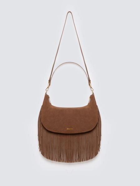 Brązowa Jednokomorowa Duża Torebka w Stylu Boho Ozdobiona Frędzlami Rivanete