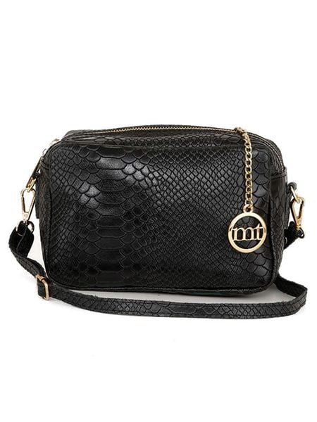 – materiał: skóra- powierzchnia: o fakturze krokodylej skóry- długi pasek przez ramię: regulowany, odpinany- zapięcie: suwak- kieszenie wewnętrzne: 1 kieszeń na zamek- wewnętrzne detale: dzielona komora główna- detale: zawieszka- tekstylna podszewka: tak- wyprodukowano we Włoszech